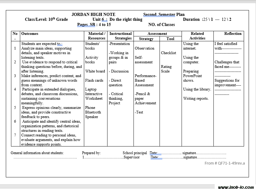 الخطة الفصلية وتحليل المحتوى لمادة اللغة الانجليزية jordan high note الصف العاشر الفصل الثاني 2026