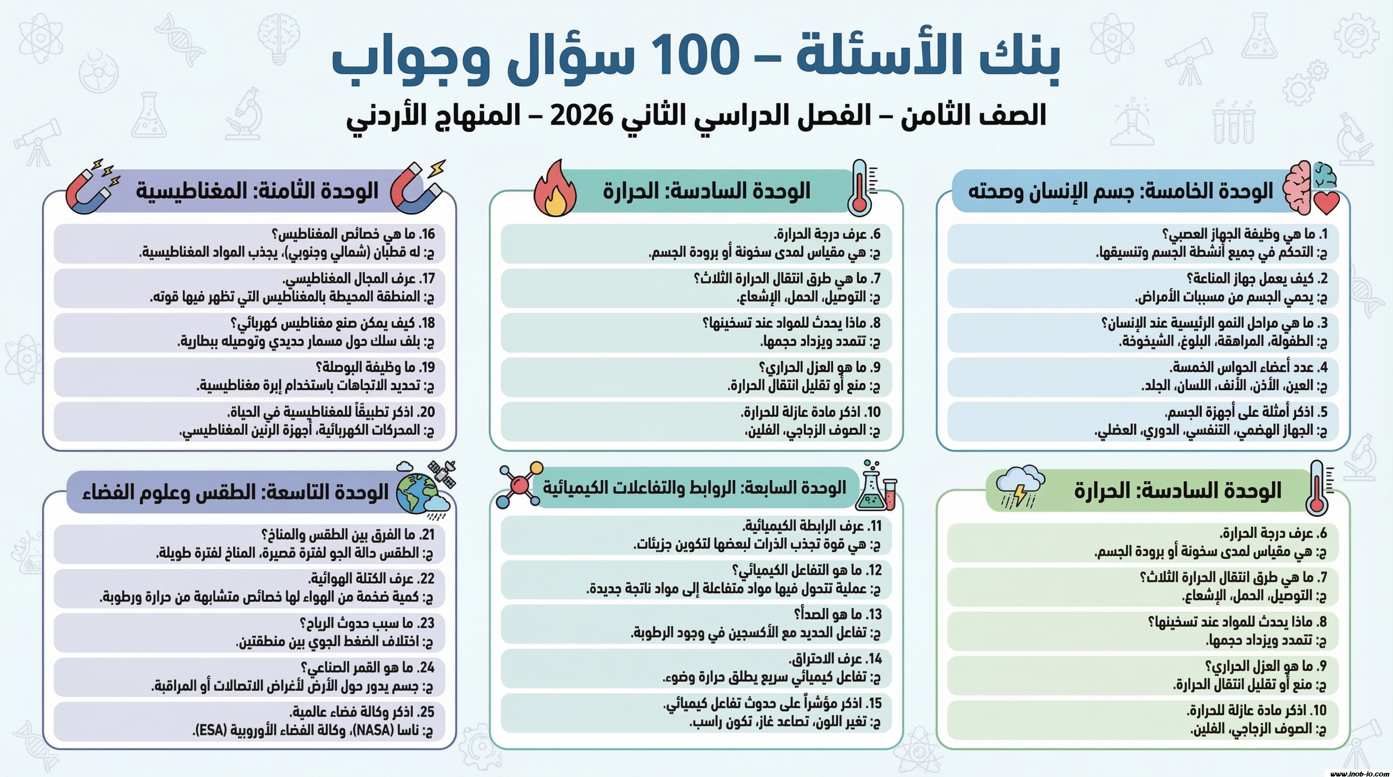 بنك اسئلة 100 سؤال وجواب على جميع الوحدات لمادة العلوم الصف الثامن لفصل الثاني 2026