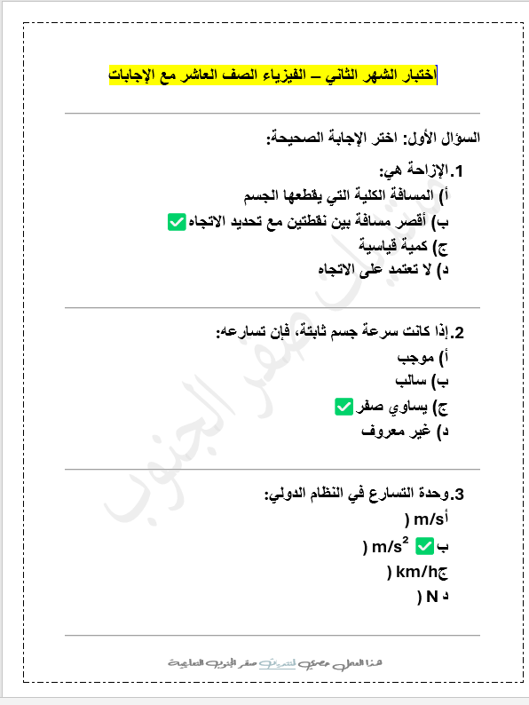 Word امتحان الشهر الثاني لمادة الفيزياء collins الصف العاشر الفصل الثاني نموذج 4