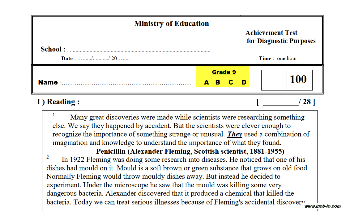 نموذج امتحان تشخيصي لمادة اللغة الانجليزية الصف التاسع الفصل الاول