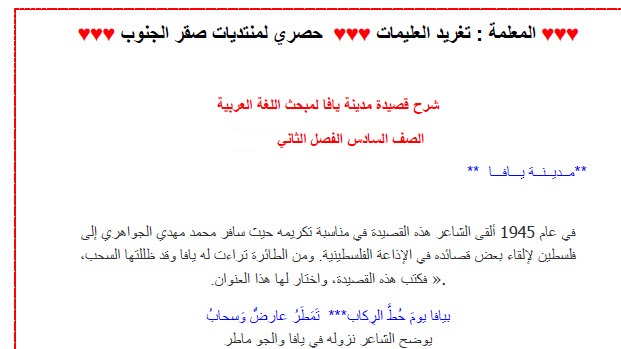 شرح قصيدة مدينة يافا للشاعر محمد مهدي الجواهري لمبحث اللغة العربية للصف السادس الفصل الثاني