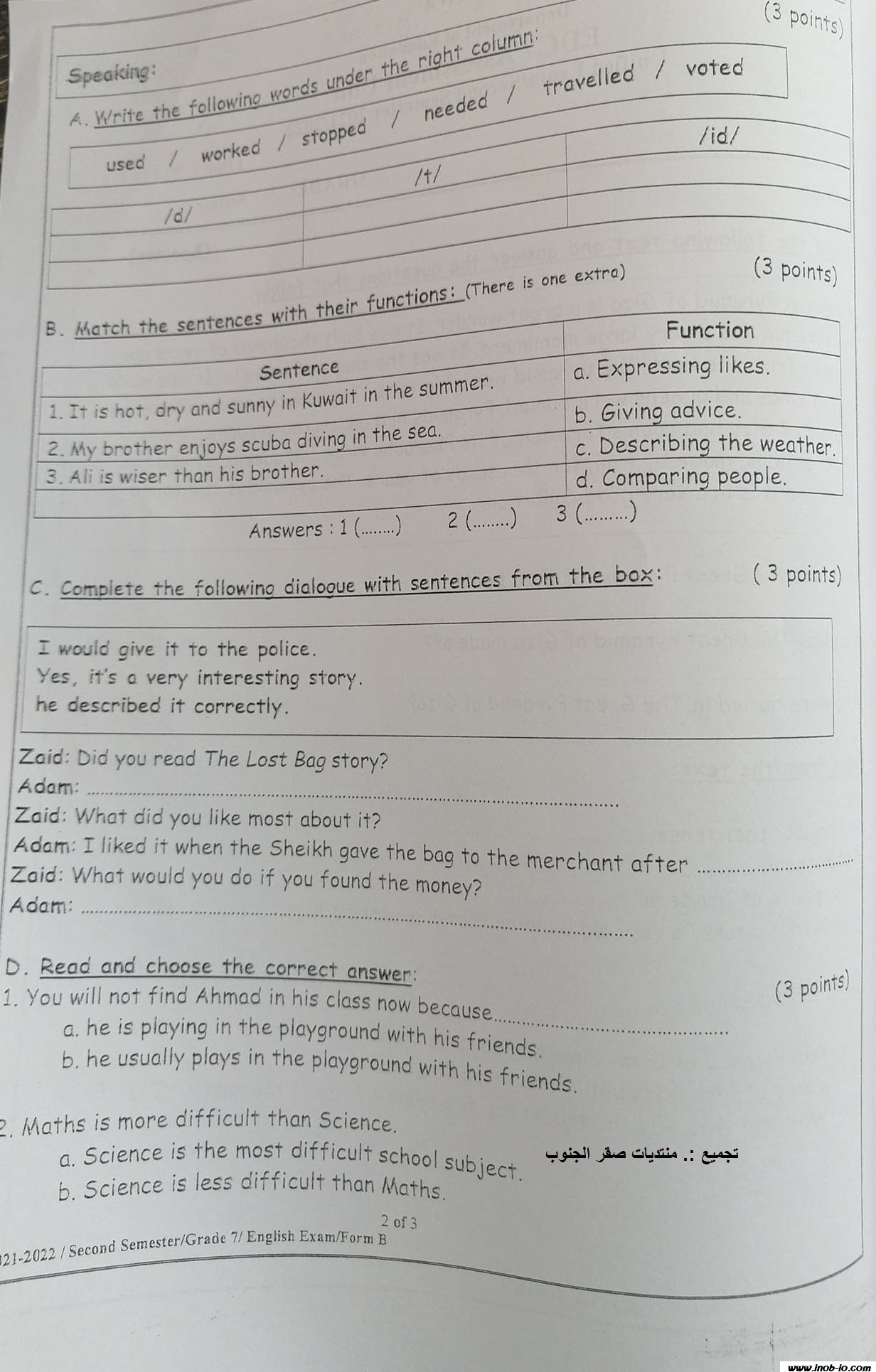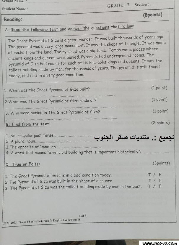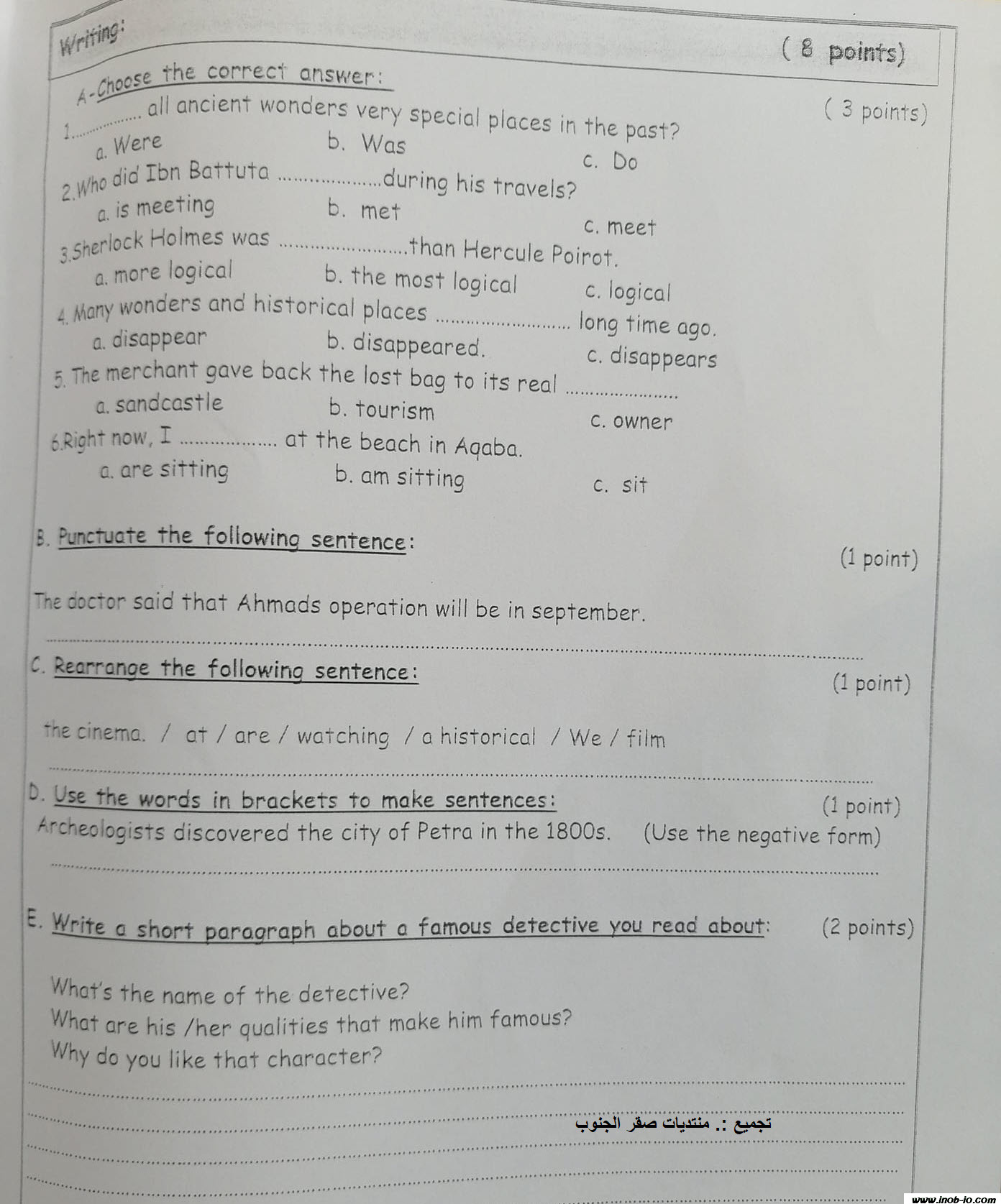 نموذج (الانروا):الاختبار النهائي لمبحث اللغة الإنجليزية للصف السابع السنوات سابقة أهلا وسهلا بكم زوارنا :) زوار :. موقع ومنتديات صقر الجنوب التعليمية :) نتمنى لكم كل المتعة والفائدة في موقعنا ;) -------------------------- ⬇️⬇️⬇️⬇️...
