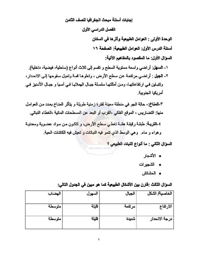 إجابات مادة الجغرافيا للصف الثامن الفصل الاول