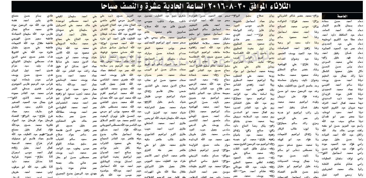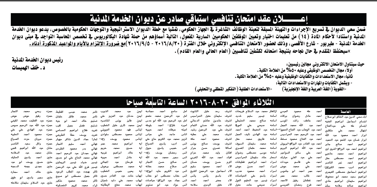 اسماء المدعوين لحضور الامتحان التنافسي الاستباقي من حملة شهادة البكالوريوس في تخصص المحاسبة خلال الفترة من 30/8/2016 حتى 5/9/2016