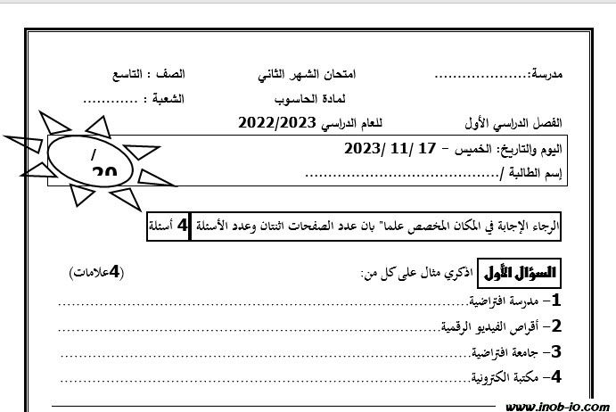 نموذج -3- قابل للتعديل اختبار الشهر الثاني لمبحث الحاسوب للصف التاسع الفصل الأول