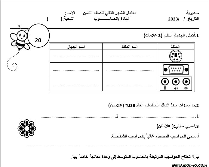 نموذج -2- Word قابل للتعديل امتحان الشهر الثاني لمادة الحاسوب الصف الثامن الفصل الاول