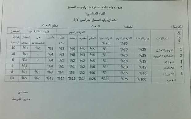 هذا جدول مواصفات لمادة اللغة العربية يصلح من الصف الرابع حتى السابع الفصل الاول