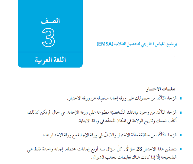 اختبار emsa التعبير الكتابي والقراءة لمادة اللغة العربية الصف الثالث المنهاج الاماراتي