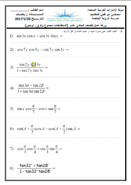 لتحميل الملف قم بالضغط هنا تقدم لكم منتديات صقر الجنوب ورقه عمل المتطابقات مجموع وفرق زاويتين للصف الحادي عشر الفصل الثاني 2017