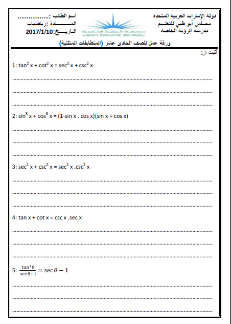 ورقه عمل المتطابقات المثلية لماده الرياضيات للصف الحادي عشر الفصل الثاني لتحميل الملف قم بالضغط هنا تقدم لكم منتديات صقر الجنوب