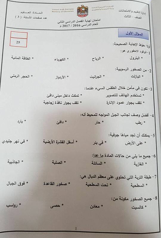 الامتحان النهائي للفصل الثاني لمادة العلوم للصف الثالث