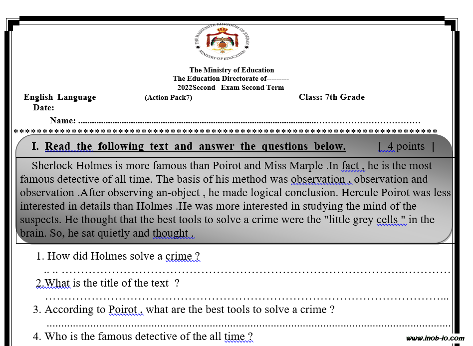 نموذج -4- Word قابل للتعديل اختبار الشهر الثاني لمادة اللغة الانجليزية الصف السابع الفصل الثاني