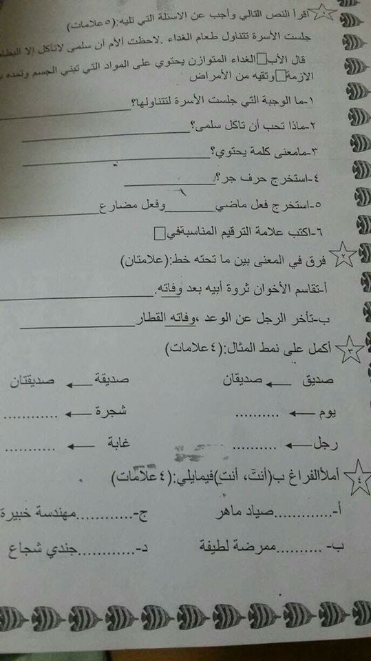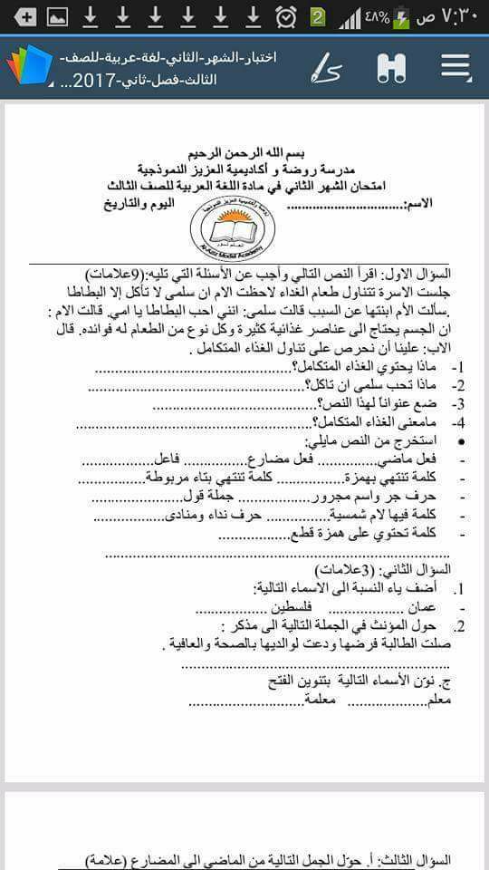 بالصور : نماذج متنوعة لاختبار الشهر الثاني لمادة اللغة العربية للصف الثالث الفصل الثاني