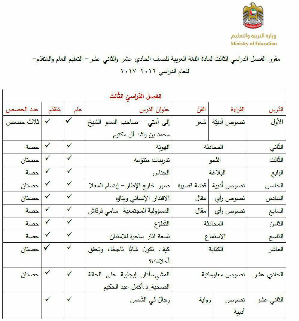 مقرر الفصل الدراسي الثالث لمادة اللغة العربية الصف الحادي عشر والثاني عشر التعليم العام والتعليم المتقدم 2017-2018