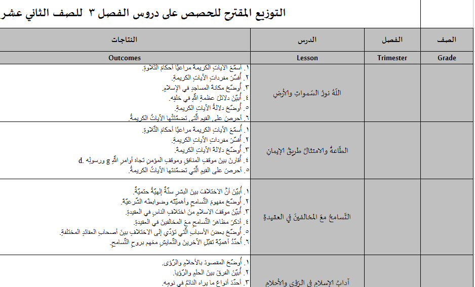 التوزيع المقترح لمادة التربية الاسلامية للحصص على دروس الفصل 3 للصف الثاني عشر العام 2017