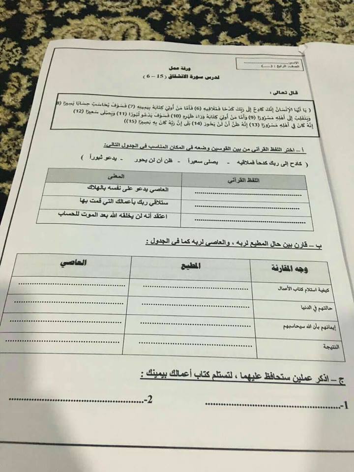 مجموعة أوراق عمل عن سورة الانشقاق ودرس الرفق لمادة التربية الاسلامية الصف الرابع الفصل الثالث