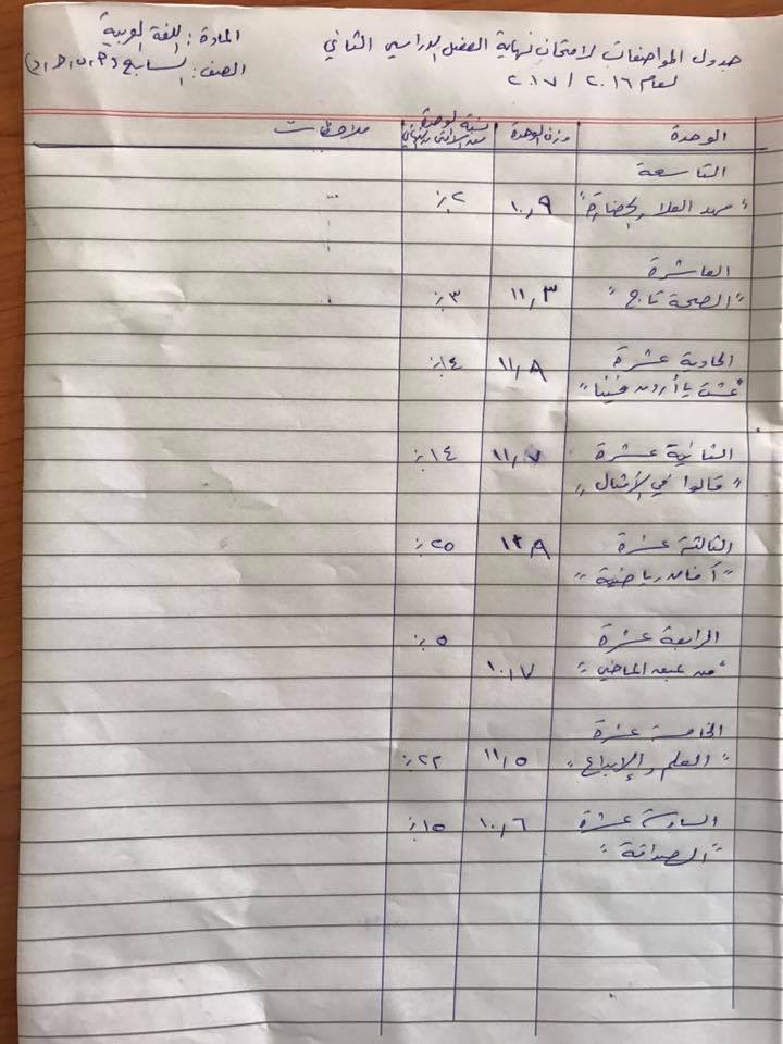 بالصور جدول مواصفات اللغة العربية للصف السابع الفصل الثاني