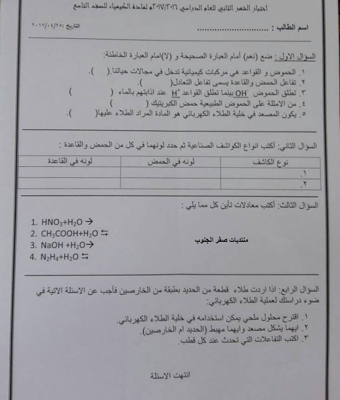 بالصور:اختبار الشهر الثاني لمادة الكيمياء للصف التاسع الفصل الثاني2017