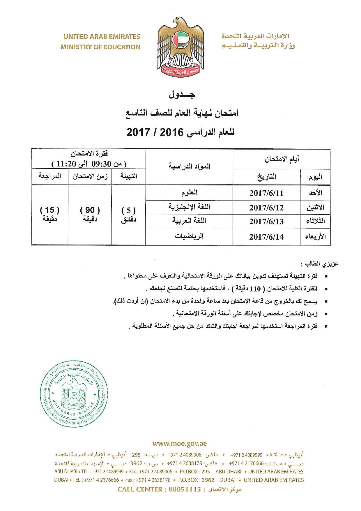 جدول امتحان نهاية العام الدراسي لجميع مواد الصف التاسع للفصل الثالث مصدق من قبل الوزارة 2016-2017