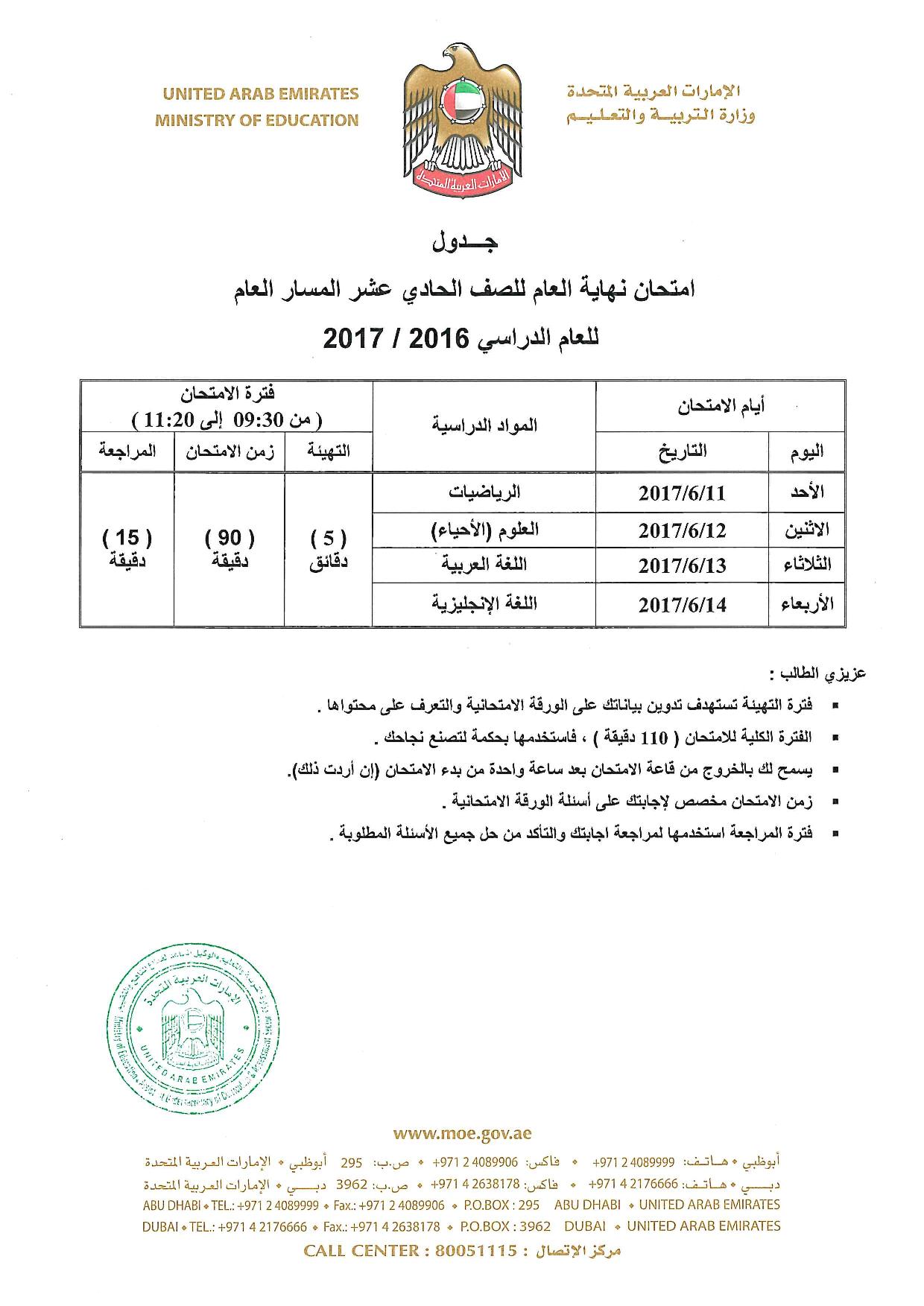 جدول امتحان نهاية العام الدراسي لجميع مواد الصف الحادي عشر المسار العام للفصل الثالث مصدق من قبل الوزارة