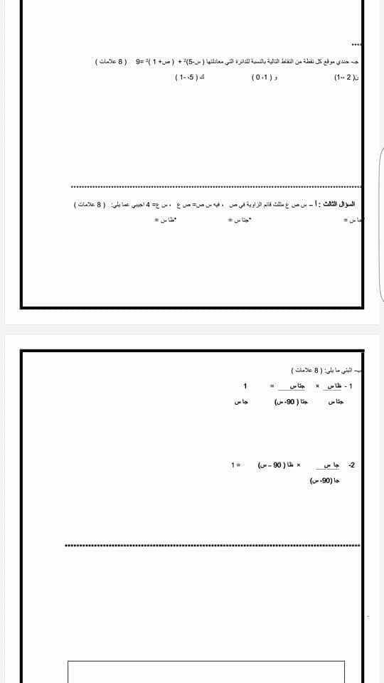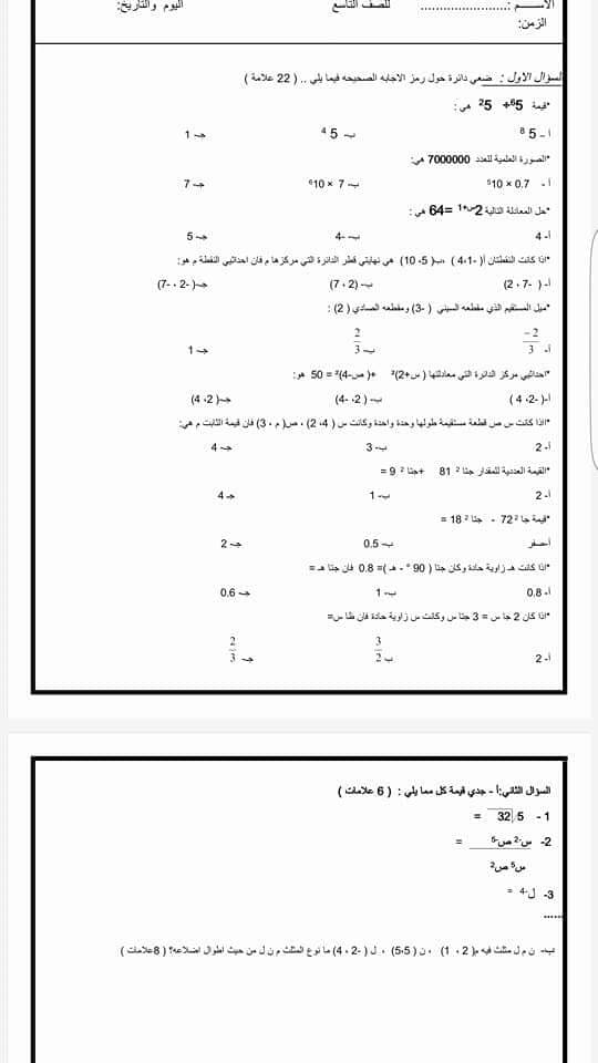 بالصور :. الاختبار النهائي لمادة الرياضيات للصف التاسع الفصل الثاني 2018