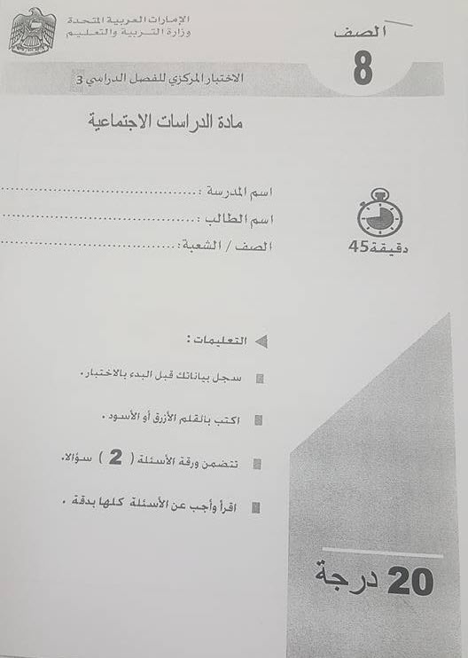 امتحان مادة الدرسات الاجتماعية والتربية الوطنية الصف الثامن الفصل الثالث بتاريخ اليوم الثلاثاء الموافق 16-05-2017السلام عليكم ورحمة الله وبركاته