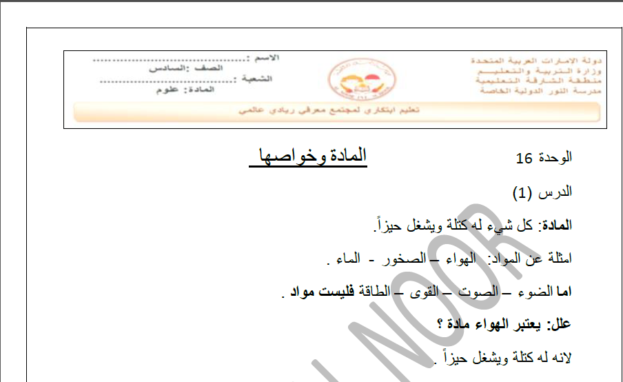 أورق عمل لدرس المادة و خواصها لمادة العلوم الصف السادس الفصل الثالث