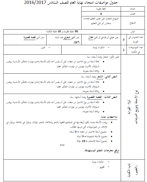 جدول مواصفات امتحان نهاية العام للصف السادس جدول مواصفات امتحان نهاية العام للصف السادس 2016-2017
