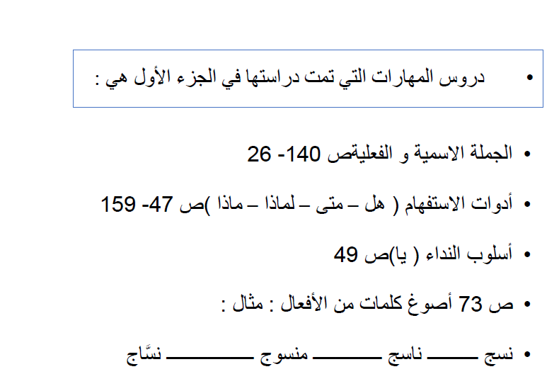 دروس المهارات التي تمت دراستها في الجزء الاول لمادة اللغة العربية للصف الثالث