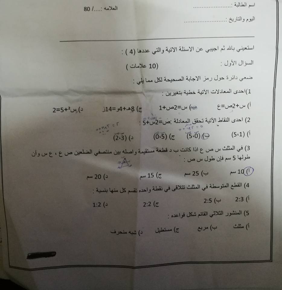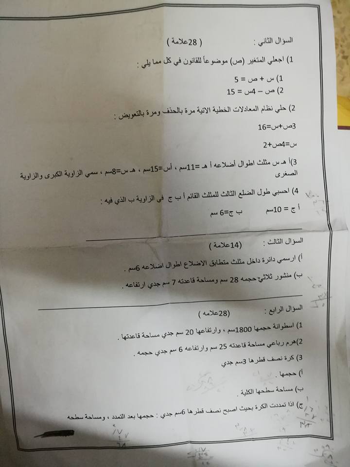 بالصور نموذج جديد الاختبار النهائي لمادة الرياضيات للصف الثامن الفصل الثاني 2018
