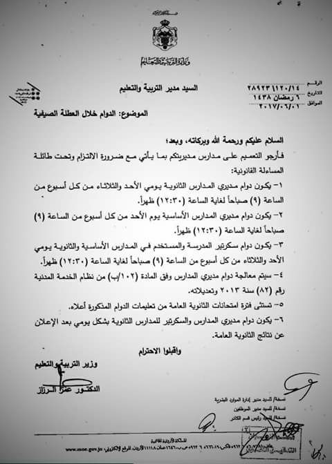 كتاب من وزارة التربية والتعليم يوضح طبيعة الدوام خلال العطلة الصيفية 2016-2017