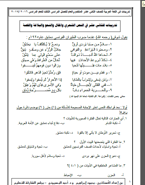 تدريبات في اللغة العربية للصف الثاني عشر الفصل الثالث لتحميل الملف PDF اضغط هنا وتابع