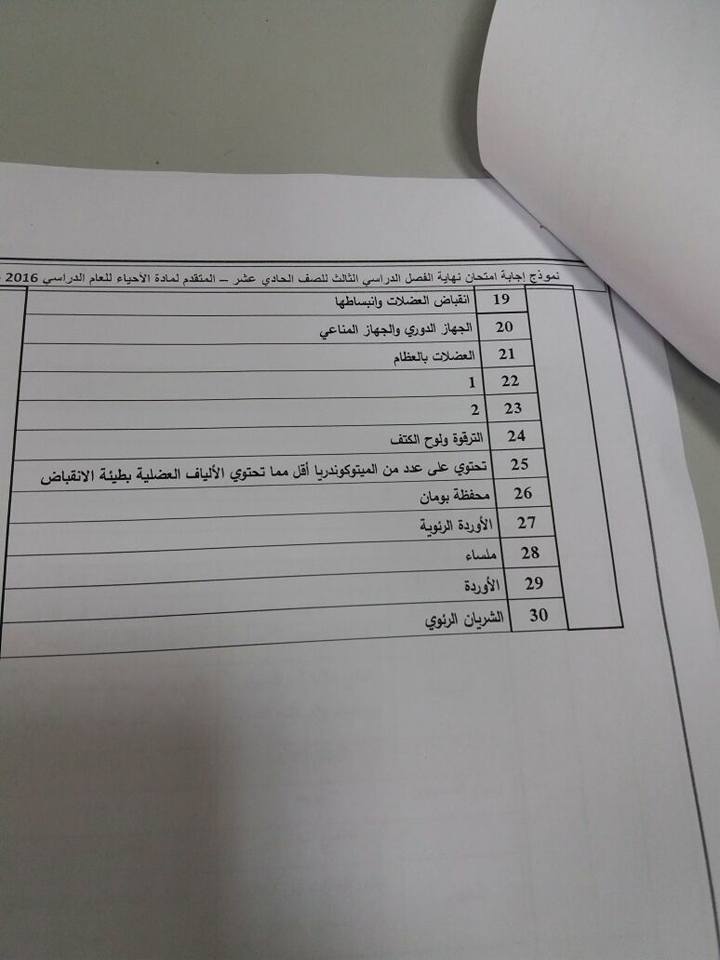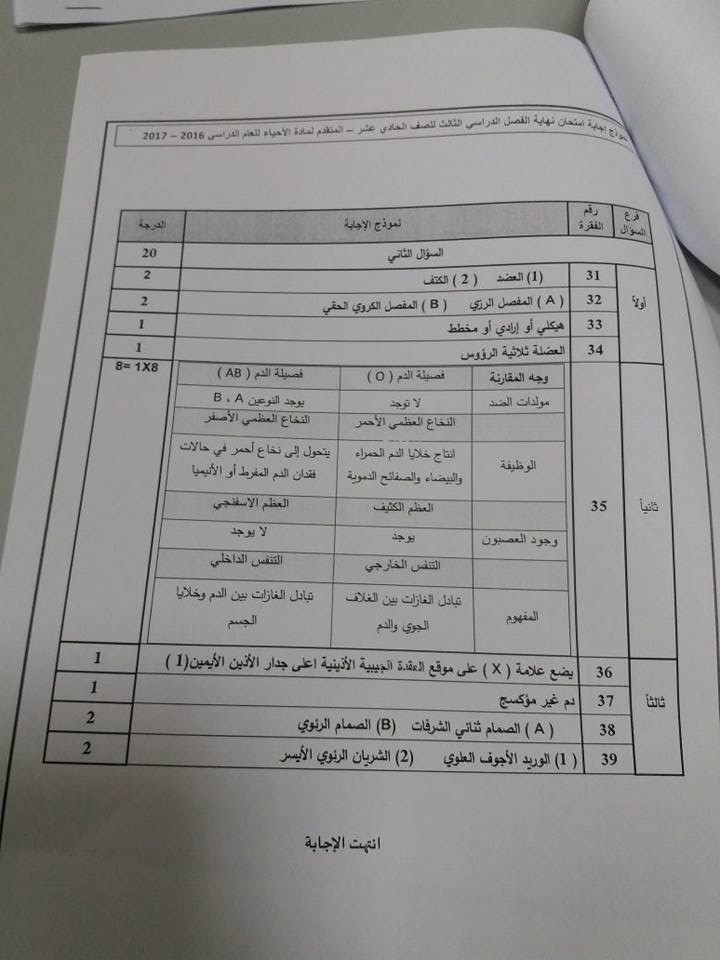 بالصور + ملف PDF نموذج اجابات امتحان مادة الاحياء نهاية الفصل الدراسي الثالث للصف الحادي عشر المتقدم 2016-2017
