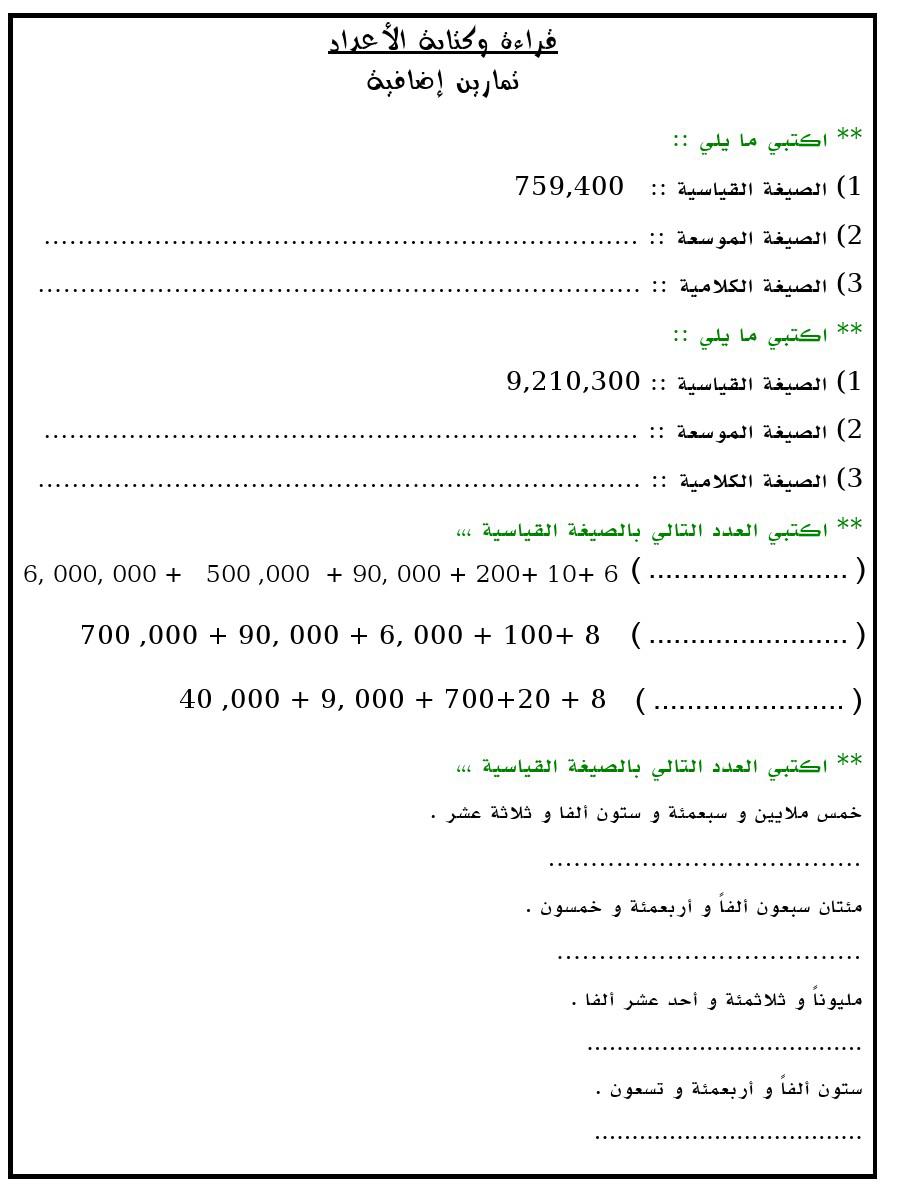 مراجعة في الرياضيات للصف الرابع قراءة وكتابة الأعداد الفصل الاول