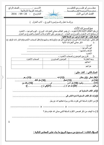 ننقل لكم - ورقة عمل تربية إسلامية في سورة البروج وآداب المنزل الصف الرابع الفصل الاول لتحميل الملف PDF اضغط هنا وتابع