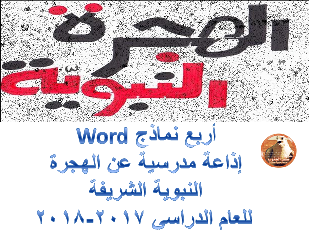أربع نماذج Word إذاعة مدرسية عن الهجرة النبوية الشريفة للعام الدراسي 2017-2018 لتحميل النموذج الاول اضغط هنا لتحميل النموذج الثاني اضغط هنا لتحميل النموذج الثالث اضغط هنا لتحميل النموذج الرابع اضغط هنا او التحميل من المرفقات