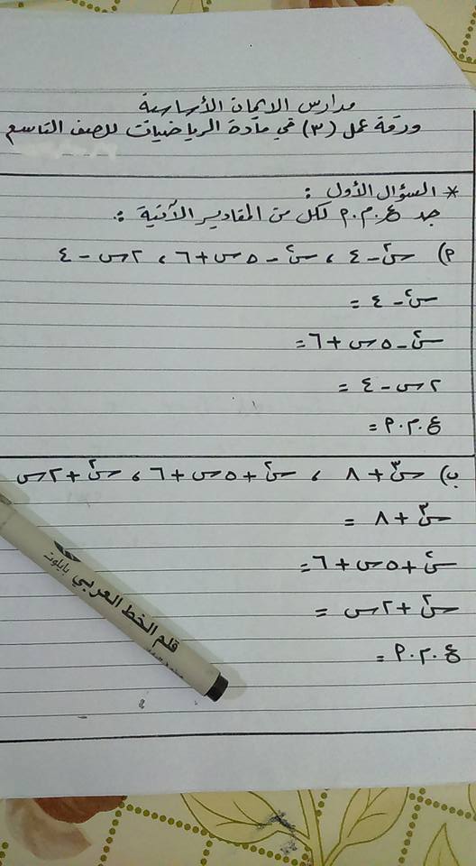ننقل لكم بالصور:ورقة عمل لمادة الرياضيات للصف التاسع الفصل الأول