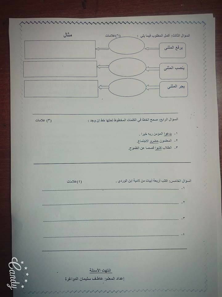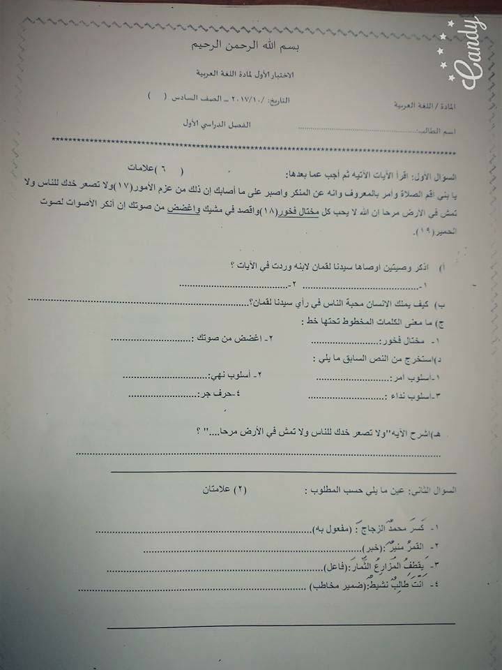 ننقل لكم بالصور: نموذج لامتحان الشهر الأول لمادة اللغة العربية للصف السادس الفصل الأول
