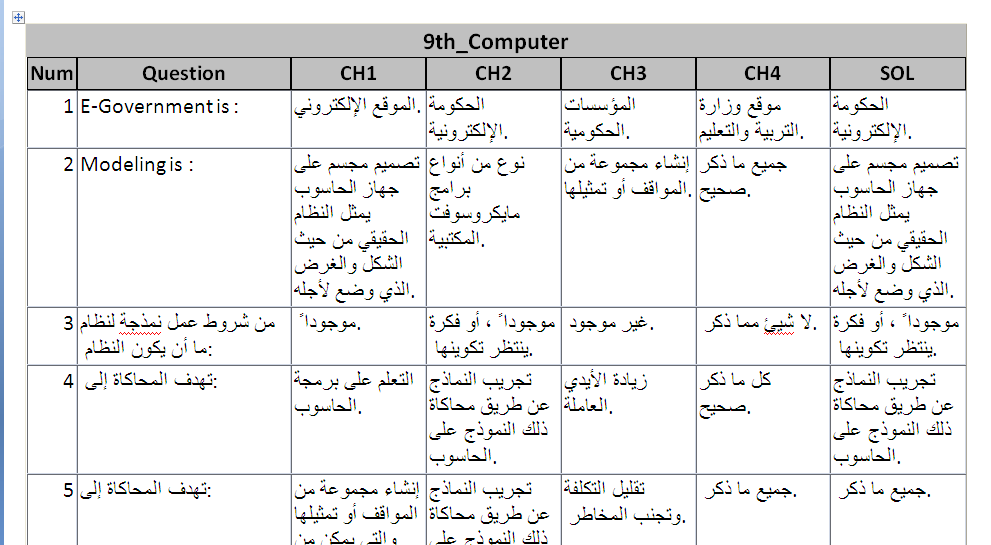 نموذج Word قابل للتعديل ضع دائرة 81 سوال مع الخيارات الأربعة والإجابة لمادة الحاسوب للصف التاسع الفصل الأول