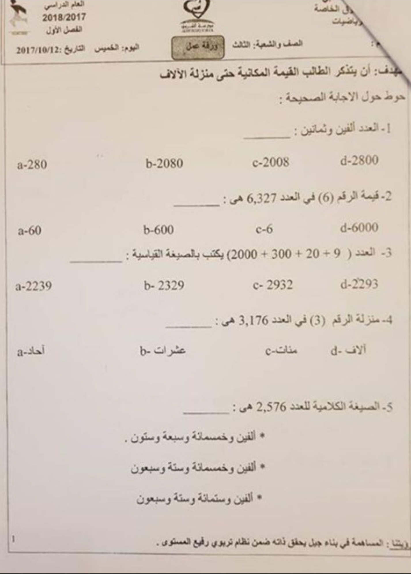 اوراق عمل لمادة الرياضيات للصف الثالث الفصل الاول