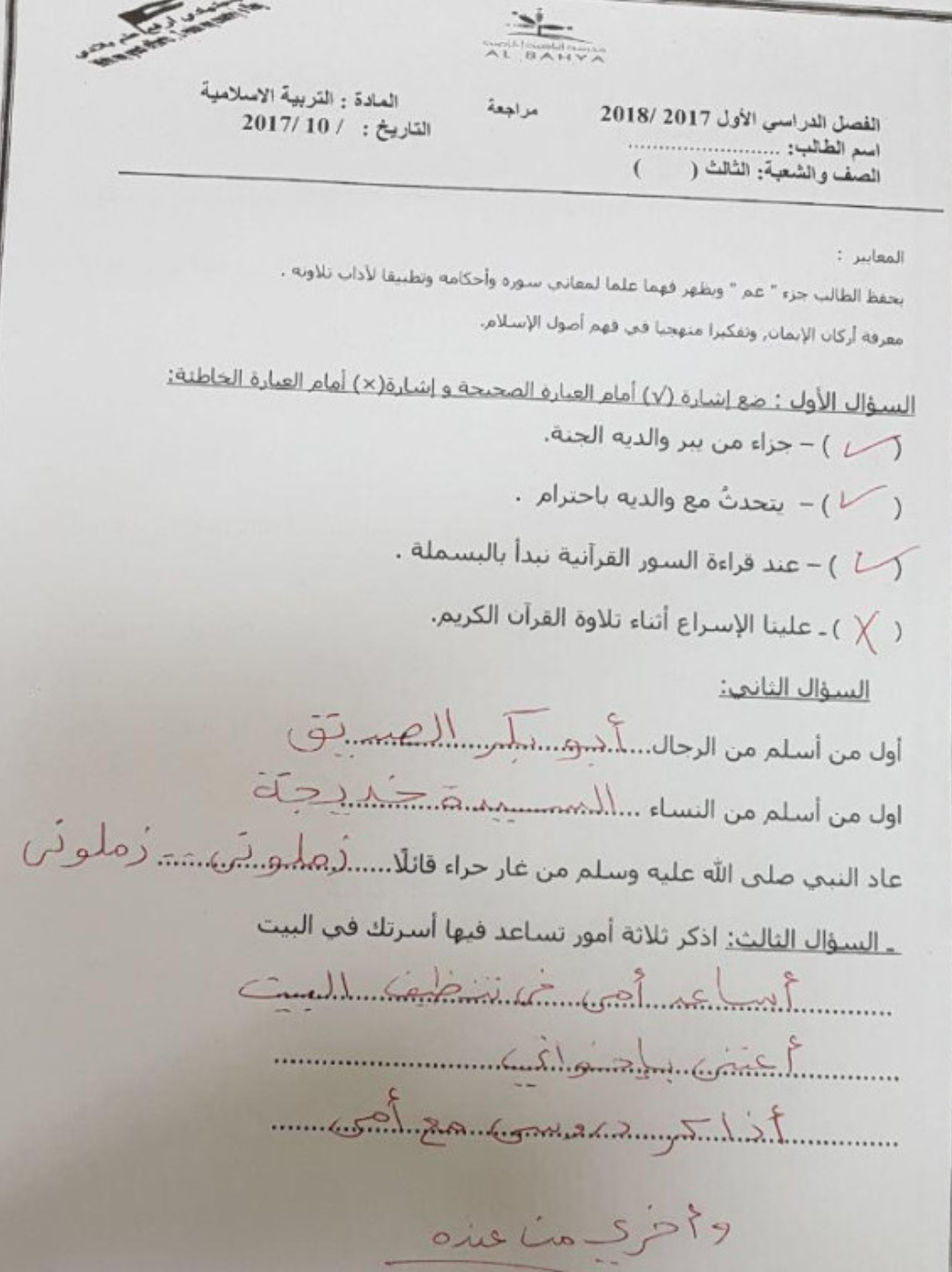 مراجعة في مادة التربية الاسلامية للصف الثالث الفصل الدراسي الاول