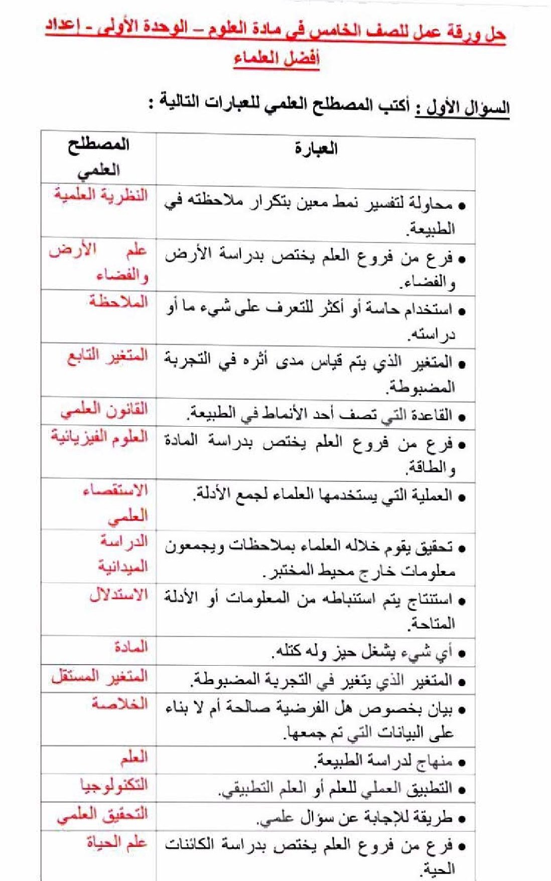 اوراق عمل + الحلول للوحدة الاولى أفضل العلماء لمادة العلوم الصف الخامس الفصل الاول