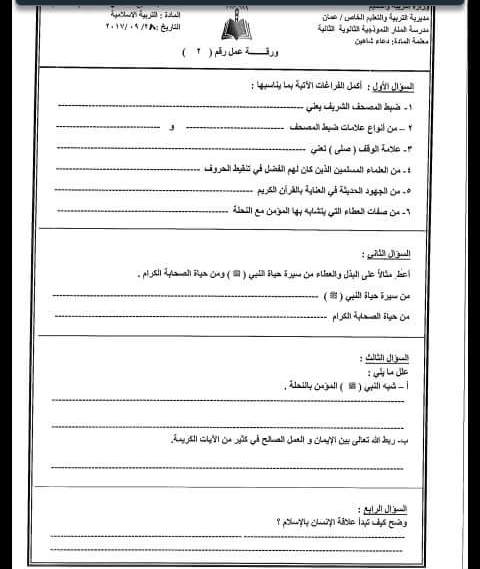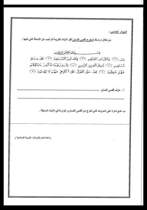 نماذج (امتحان الشهر الأول (التربية الإسلامية )للصف السابع الفصل الأول