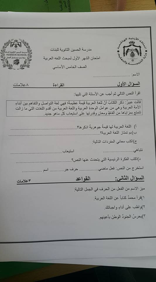 نموذج جديد لامتحان الشهر الأول لمادة اللغة العربية للصف الخامس الفصل الأول