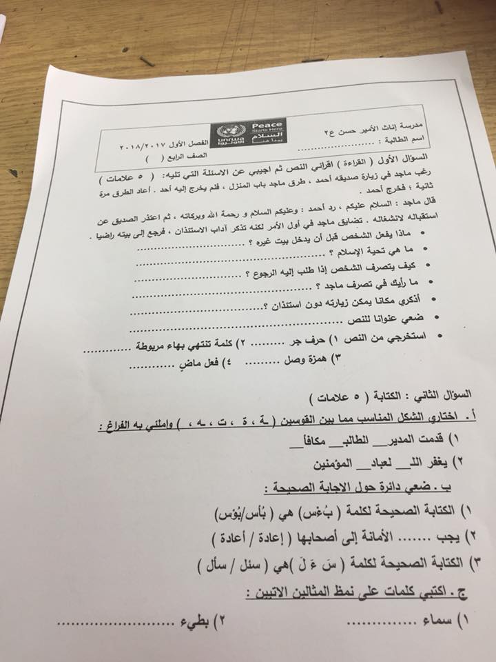 ننقل لكم : نموذج جديد لامتحان الشهر الأول لمادة اللغة العربية للصف الرابع الفصل الأول