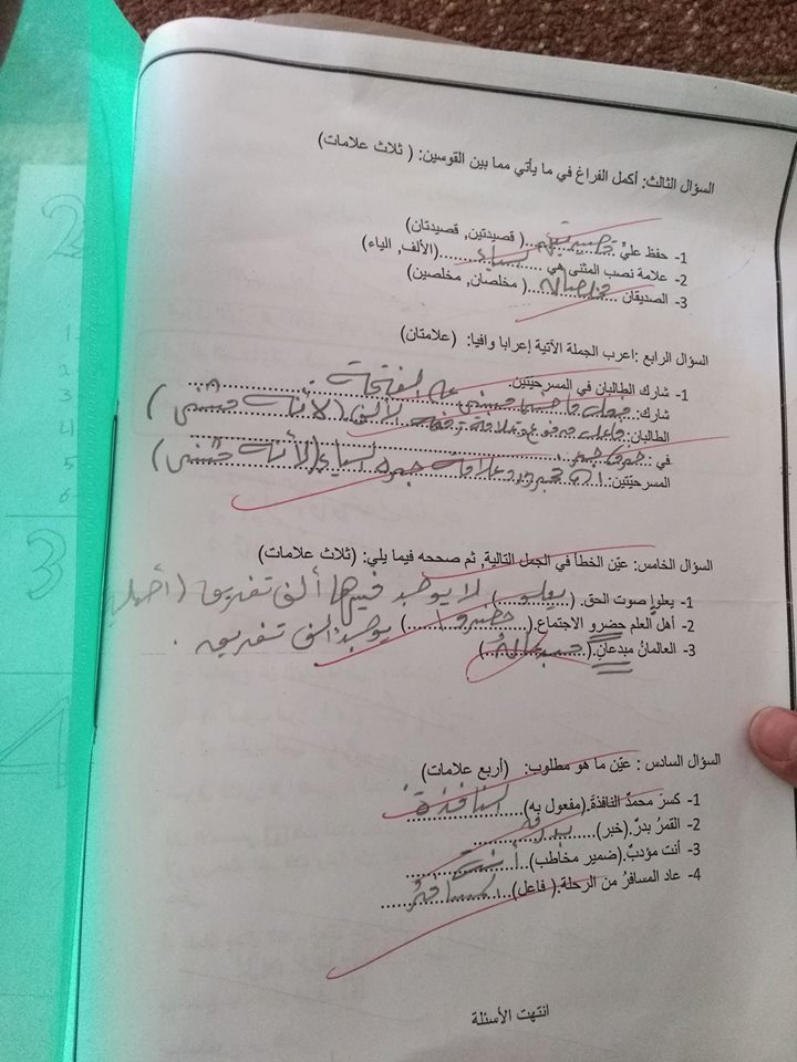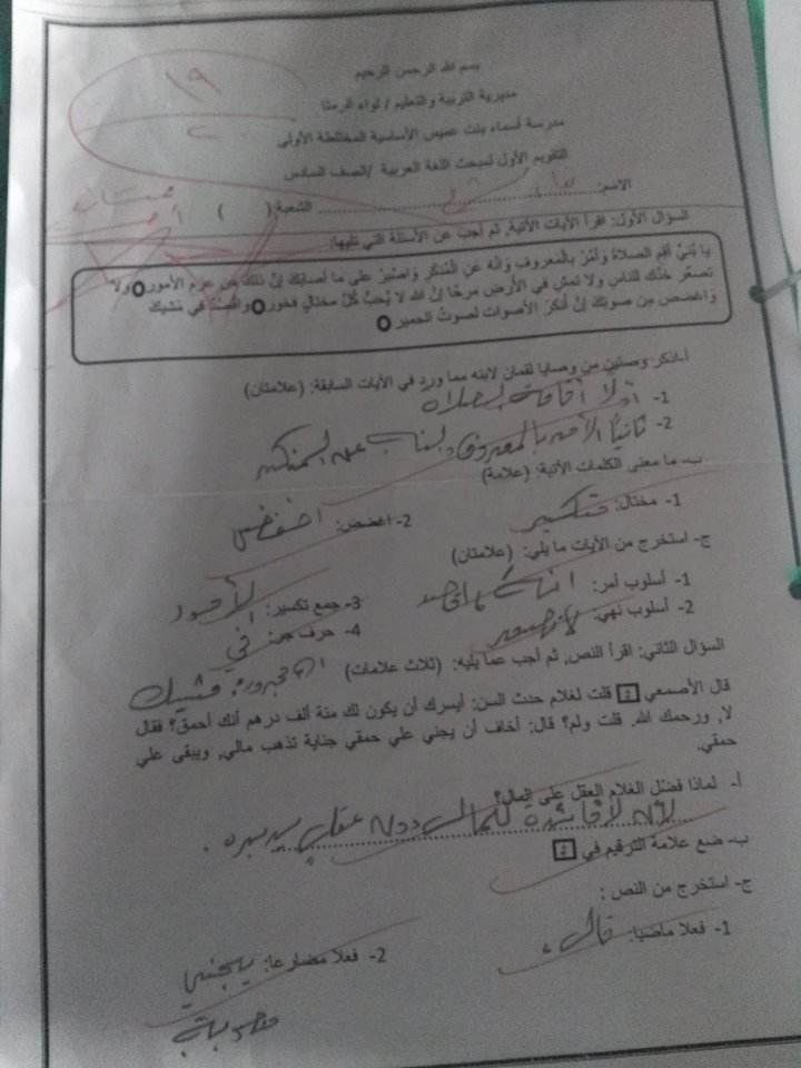 نموذج جديد:لامتحان الشهر الأول لمادة اللغة العربية للصف السادس الفصل الأول