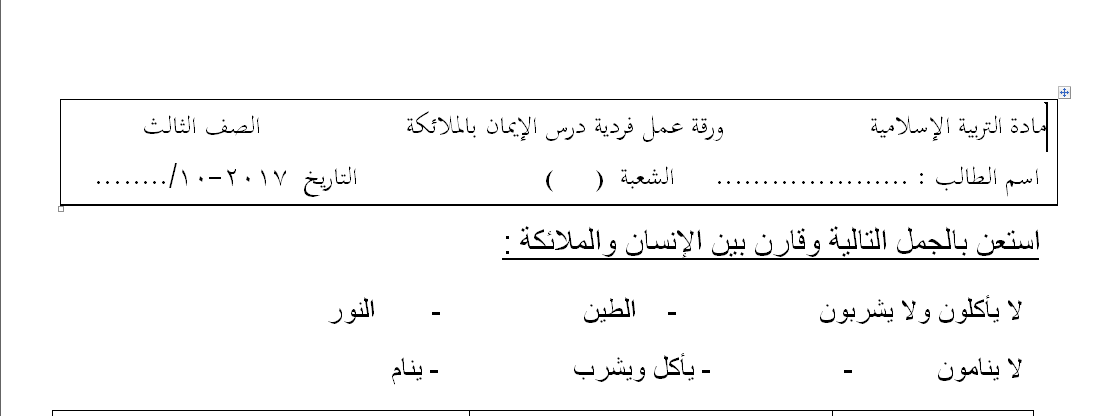 نموذج Word قابل للتعديل ورقة عمل فردية درس الإيمان بالملائكة لمادة التربية الاسلامية الصف الثالث الفصل الاول