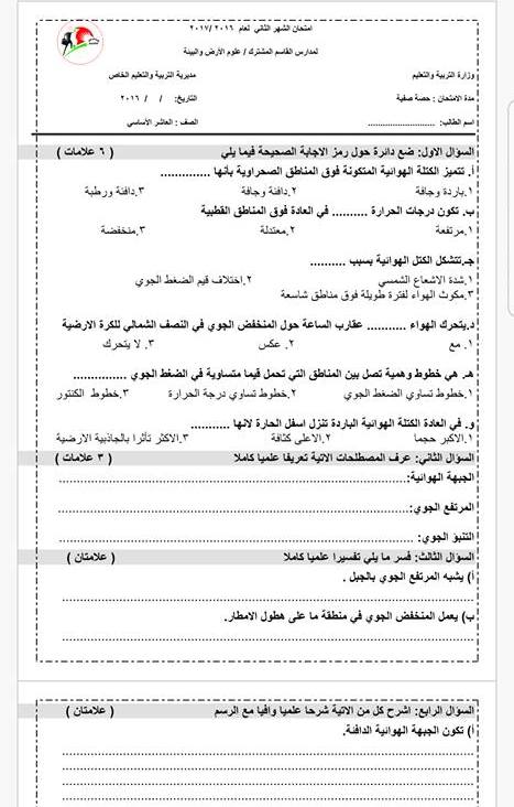 نموذج لامتحان الشهر الثاني لمادة علوم الأرض للصف العاشر الفصل الأول