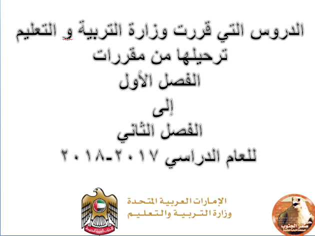 وجهّت وزارة التربية والتعليم في الامارات العربية المتحدة بترحيل عدداً من دروس مقررات الفصل الدراسي الأول من العام الدراسي 2017-2018 إلى الفصل الدراسي الثاني, وهذه الدروس هي كالاتي - بحسب الصف- :