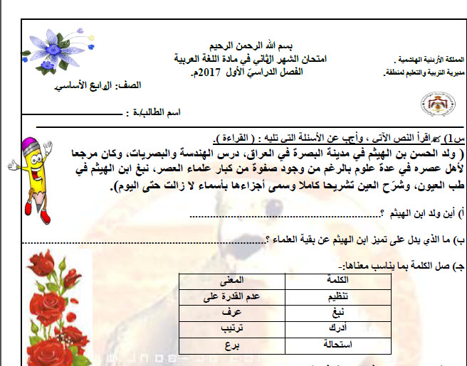 حصري نموذج اختبار مادة اللغة العربية للصف الرابع الشهر الثاني الفصل الاول 2017-2018